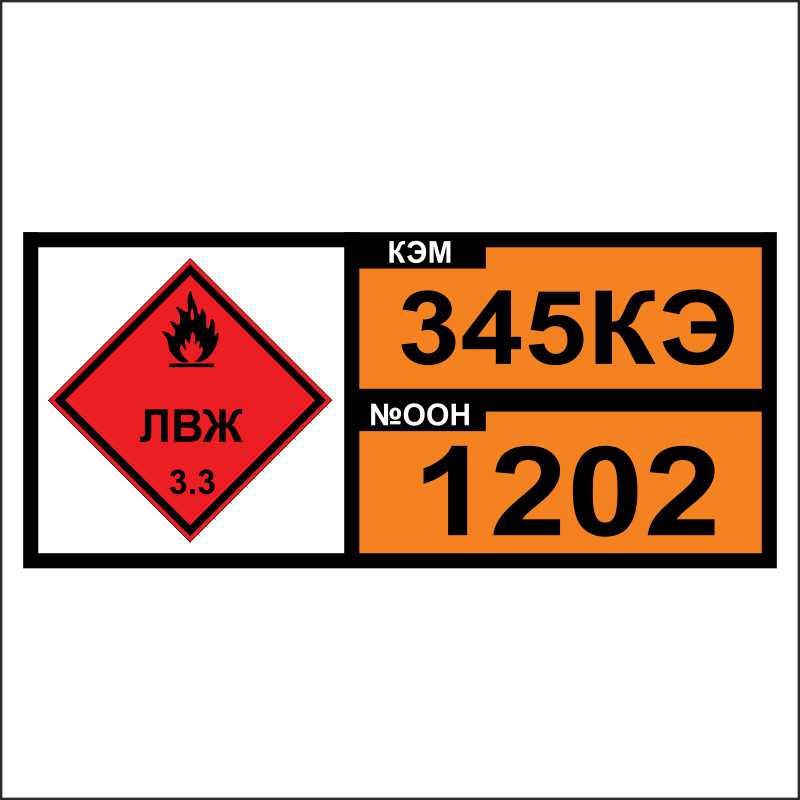 Знак опасности. Табличка номер опасности и номер ООН (OON345КЭ-1202) (Дизельное топливо) входит в группу знаков опасности и маркировки опасных грузов. Используется для обеспечения безопасности транспортировки грузов, которые могут причинить вред здоровью человека и окружающей среде.